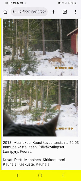 20.3.2018. 2018. Maaliskuu. Onnellisuuden päivä. Aikaisempia peurakuvia: "Peura saapuu ikkunan alle ja kiinnittää kaiken huomion tässä uudessa ympäristössä. Rasmus-kissakin on erityisen kiinnostunut tästä otuksesta, jonka hän näkee ensimmäistä kertaa elämässään. Uutislähetys jatkuu Juhannuksen liikenteestä kertovalla jutulla." https://www.nettisanomat.com/2018/03/20/etusivu.html