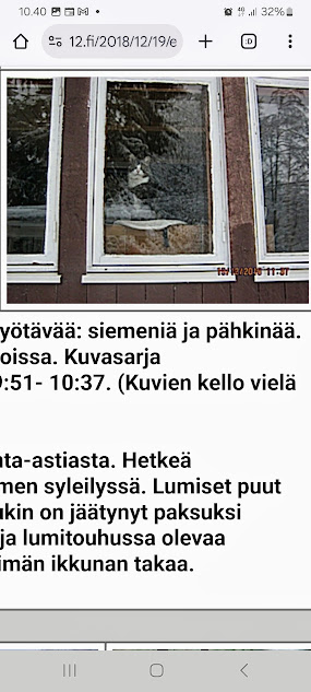 Lumen keskellä löytyy linnuille syötävää: siemeniä ja pähkinää. Kissa oleilee mieluummin sisätiloissa. Kuvasarja Keskiviikkona 19.12.2018 klo 09:51- 10:37. (Kuvien kello vielä kesäajassa!) Linnut löytävät ruokaansa ruokinta-astiasta. Hetkeä myöhenmmin lähempää. Talo lumen syleilyssä. Lumiset puut kolme kertaa. Kissan juoksunarukin on jäätynyt paksuksi pötkäleeksi. Lumista maisemaa ja lumitouhussa olevaa isäntääkin on kiva katsella lämpimän ikkunan takaa. Kuvat: Pertti Manninen. https://www.nettisanomat.com/2018/12/19/etusivu.html |