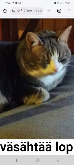 Sanomanetti nro 3102 - Sunnuntai 29.6.2025. - Arkisto. - Rasmuksen matkassa 17 vuotta. Kiitos. Lue! 2018 - 2019. Lue! - 2008 - 2009. Täällä - 2010 - 2011. - Täällä 2012 - 2013. Täällä - 2014 - 2015. Täällä - 2016 - 2017. Täällä - Arkisto. 20.3.2018. "Rasmus-kissakin on erityisen kiinnostunut tästä otuksesta. " 2018. Maaliskuu. Onnellisuuden päivä. Peurat tulevat tervehtimään aivan ikkunan alle lintujen pudottamia pähkinöitä mutustelemaan. Radiossa kerrotaan myöhemmin, että tänään on Kansainvälinen onnellisuuden päivä. On myös kevätpäivän tasaus. Muistojen Bulevardissa soi Imagine ja kappaleen loputtua toimittaja kertoo, että tänään on myös päivä, jolloin John Lennon ja Yoko Ono vihittiin (1969). Kun en näistä vielä tänään tiennyt, siis kevätpäivän tasauksesta ja tästä vihkimisestä ajattelin nostaa tänne ensimmäiseksi vuosia sitten tekemäni käännöksen Smile-laulusta. Tietenkin ensimmäistä kertaa näin lähelle tänä talvena tulleet peurat veivät voiton. Kuvat: Pertti Manninen. Kirkkonummi. Kauhala. Tiistai 20.03.2018 8:49 ja teksti 12:30. Aikaisempia peurakuvia: "Peura saapuu ikkunan alle ja kiinnittää kaiken huomion tässä uudessa ympäristössä. Rasmus-kissakin on erityisen kiinnostunut tästä otuksesta, jonka hän näkee ensimmäistä kertaa elämässään. Uutislähetys jatkuu Juhannuksen liikenteestä kertovalla jutulla." Kuvat: Pertti Manninen. Uusimaa. Kirkkonummi. Kauhala klo 20:35 - 20:52. - 21.3.2018. 2018. Maaliskuu. Kuusi kuvaa keskiviikkona 21.03 iltapäivällä. Peura ja hirvet. Kuvat: Pertti Manninen. Kirkkonummmi. Kauhala. - l 22.3.2018. 2018. Maaliskuu. Kuusi kuvaa torstaina 22.03 aamupäivästä iltaan. Päiväkotilapset. Lumipyry. Peurat. Kuvat: Pertti Manninen. Kirkkonummi. Kauhala. Keskusta. Kauhala. - 10.8.2018. "Rasmus-kissa nukahtamaisillaan juomakuppinsa viereen tv:n lähettäessä ohjelmaa Tove Janssonin elämästä tutun musiikin soidessa." Tove Jansson 104 vuotta Lue! Arkisto 2014. Tove Jansson 100 vuotta tänään. Kuva: Rasmus-kissa nukahtamaisillaan juomakuppinsa viereen tv:n lähettäessä ohjelmaa Tove Janssonin elämästä tutun musiikin soidessa. Perjantaina 08.08.2014 klo 18:46. Kuva: Pertti Manninen. Isonna! Katso myös! Joulukuu 2013. "Unelma valkeasta joulusta" - "Ja aamulla ..." Kuvat Mitäs tämä on? - Mutta peikko kulta, miten sait nelosen käytöksestä? Kuvasarja 8.8.2018. Humppilassa Iittalan myymälässä Juhla-Muumi-mukit olivat loppuneet sinne ehtiessäni Erikan soitettua hiukan liian myöhään tai sitten liikaa hidastellessani sinne kiiruhtaessani. Monet jäivät ilman sielläkin. Pertti Manninen. - 19.12.2018. "Kissa oleilee mieluummin sisätiloissa. Lumista maisemaa ja lumitouhussa olevaa isäntääkin on kiva katsella lämpimän ikkunan takaa." Lumen keskellä löytyy linnuille syötävää: siemeniä ja pähkinää. Kissa oleilee mieluummin sisätiloissa. Kuvasarja Keskiviikkona 19.12.2018 klo 09:51- 10:37. (Kuvien kello vielä kesäajassa!) Linnut löytävät ruokaansa ruokinta-astiasta. Hetkeä myöhenmmin lähempää. Talo lumen syleilyssä. Lumiset puut kolme kertaa. Kissan juoksunarukin on jäätynyt paksuksi pötkäleeksi. Lumista maisemaa ja lumitouhussa olevaa isäntääkin on kiva katsella lämpimän ikkunan takaa. Kuvat: Pertti Manninen. - 24.11.2019. Sunnuntai 24.11.2019. Marraskuu. Ajan kuvia. 22:10 Rasmus-kissa väsähtää lopulta tuolilleen oltuaan ihan oman hoitajansa sylissä useita tunteja matkan jälkeen. Kuvat: Pertti Manninen sunnuntaina 24.11.2019 11:12- 22:10 Keski-Suomen Jyväskylässä ja Uudenmaan Kirkkonummella. Kuvien paikkakunnat: Jyväskylä; Helsinki, Kirkkonummi Suomessa ja Irak sekä Libyan rannikko. - Linkki 2020- 2021. Täällä - - - - - -- - - - - ---- SMILE from MODERN TIMES - --- Sivu2 - Sunnun 29.6.2025. - Kuvasanomat - Sanomatori - Viikkosanomat - Härkää sarvista - 12.fi - N:o 3102 - 2025-06-30, nettiin 2025-06-30 15:21, linkkejä 2025-06-30. "Haukkaavan logon" teki Jaikon kurssilla 1999 Mika. Ensimmäisen kerran logo oli lehdessä tortaina 30.9.1999. Pari vuoden jälkeen se korvautui steriilillä kirjainlogolla. Nyt se on taas mukana!