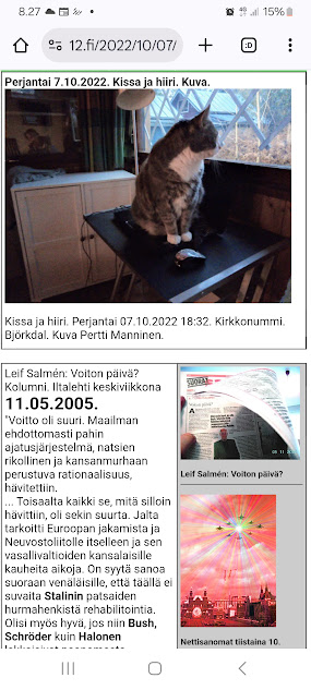 7.10.2022. "Kissa ja hiiri." Perjantai 07.10.2022 18:32. Kirkkonummi. Björkdal. Kuva Pertti Manninen. Leif Salmén: Voiton päivä? Nettisanomat tiistaina 10. toukokuuta 2005. Kuva. Supernova. Kuvitelma mahtipontisesta sotilasparaatista. Pertti Manninen. Voitonpäivä: "Maailman johtajat juhlivat sodan loppua Moskovassa. Presidentti Vladimir Putin: "Sota tuli jokaiseen kotiin. - Meidän on puolustettava nykyistä maailmanjärjestystä, joka perustuu turvallisuuteen ja oikeudenmukaisuuteen, uuteen keskinäisten suhteiden kulttuuriin, joka ei salli kylmien sotien eikä todellisten sotien toistuvan." Lähde: Keskisuomalainen 10.05.2005 2005/05/10/kuvasupernova.htm https://www.nettisanomat.com/2022/10/07/etusivu.html