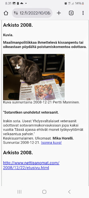 | 8.10.2022. Arkisto 2008. Kuvia. Maailmanpolitiikkaa ihmettelevä kissanpentu tai oikeastaan pöydältä poistumiskomentoa odottava. Arkisto 2008. Kuvia. "Sotaretken unohdetut veteraanit. Irakin sota. Useat Yhdysvaltalaiset veteraanit odottavat sotavammakorvauksiaan jopa kaksi vuotta Tässä ajassa ehtivät monet työkyvyttömät velkaantua pahoin." Keskisuomalainen. Ulkomaat. Mika Horelli. Sunnuntai 2008-12-21. Isonna kuva! Arkisto 2008. |