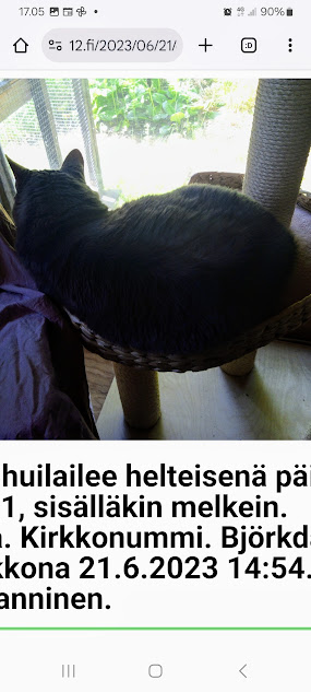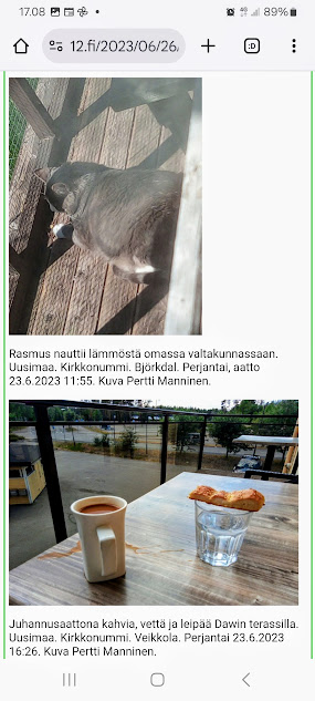 | 26.6.2023. "Rasmus nauttii lämmöstä omassa valtakunnassaan." ![]() ![]() ![]() ![]() Rasmus nauttii lämmöstä omassa valtakunnassaan. Uusimaa. Kirkkonummi. Björkdal. Perjantai, aatto 23.6.2023 11:55. Kuva Pertti Manninen. Juhannusaattona kahvia, vettä ja leipää Dawin terassilla. Uusimaa. Kirkkonummi. Veikkola. Perjantai 23.6.2023 16:26. Kuva Pertti Manninen. https://www.nettisanomat.com/2023/06/26/etusivu.html