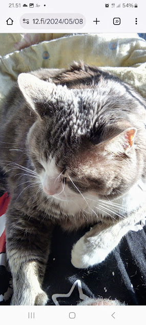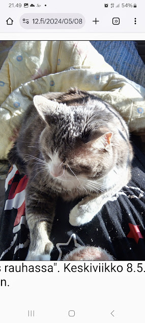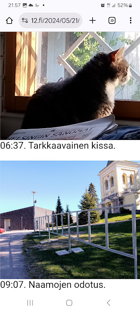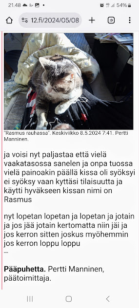 Sanomanetti nro 3106 - Torstai 3.7.2025. Arkisto. Linkit. Rasmuksen matkassa 17 vuotta. Kiitos. Lue! 2008 - 2025----- Sanomanetti nro 3105 - Keskiviikko 2.7.2025.- Arkisto. Rasmuksen matkassa 17 vuotta. Kiitos. Lue! 2024 - 2025. Lue! 2008 - 2009. Täällä 2010 - 2011. Täällä 2012 - 2013. Täällä 2014 - 2015. Täällä 2016 - 2017. Täällä 2018 - 2019. Täällä 2020 - 2021. Täällä 2022 - 2023. Täällä 8.5.2024. "Rasmus rauhassa". "Rasmus rauhassa". Keskiviikko 8.5.2024 7:41. Pertti Manninen. ... ja voisi nyt paljastaa että vielä vaakatasossa sanelen ja onpa tuossa vielä painoakin päällä kissa oli syöksyi ei syöksy vaan kyttäsi tilaisuutta ja käytti hyväkseen kissan nimi on Rasmus nyt lopetan lopetan ja lopetan ja jotain ja jos jää jotain kertomatta niin jäi ja jos kerron sitten joskus myöhemmin jos kerron loppu loppu -- Pääpuhetta. Pertti Manninen, päätoimittaja. - 8.5.2024. "Isännän varjo". "Isännän varjo". Keskiviikko 8.5.2024 8:03. Pertti Manninen. Katkelmia Iltalehden jutusta "Ylen radiotoimittaja irtisanoutui – Syynä Suomen osallistuminen Euroviisuihin". "Riia Pakkanen Eilen klo 11:20 Ylen radiotoimittaja Miikka Koivisto ilmoittaa irtisanoutuvansa työstään. YleX:llä työskennellyt Koivisto perustelee päätöstään viimeisessä lähetyksessään." "– Irtisanoudun vastalauseena Ylen osallistumiselle tämän vuoden Euroviisuihin kansanmurhaa Palestiinassa suorittavan Israelin rinnalla, hän tiedottaa radiossa." "– Tämän vuoden Euroviisut toimii hirvittäviä asioita tälläkin hetkellä tekevän Israelin valtion imagon kiillotusalustana. Yli 30 000 tapettua ihmistä ei ole ollut riittävä syy sulkea Israelia kisoista, hän jatkaa." - 21.5.2024. "Tarkkaavainen kissa.". Kulkijan kuvia aamusta iltaan tiistaina 21.5.2024. 06:37. Tarkkaavainen kissa. 09:07. Naamojen odotus. ... Paikka: Uusimaa. Kirkkonummi. Björkdal - Keskusta ... Kuvat Pertti Manninen. Tiistai 21.05.2024. - i 21.5.2024. "Kissa nukkuu pesässään!" Kulkijan kuvia aamusta iltaan tiistaina 21.5.2024. ... 16:59. Kissa nukkuu pesässään! 22:35. Kottarainen hämärässä. Paikka: Uusimaa. Kirkkonummi. Björkdal - Keskusta ... Kuvat Pertti Manninen. Tiistai 21.05.2024.- 7.9.2024. "Rasmus nauttii vuoden ehkä viimeisestä hellepäivästä parvekkeellaan." Huh hellettä syyskuussa 2024 Rasmus nauttii vuoden ehkä viimeisestä hellepäivästä parvekkeellaan torstaina 6.9.2024 16:42. Uusimaa. Kirkkonummi. Björkdal. Kuva Pertti Manninen. - 20.12.2024. "Rasmus on nousssut pöydälle auringon lämpöön, kun oikea isäntä yrittää hörppiä päiväkahviaan." "Rasmus on nousssut pöydälle auringon lämpöön, kun oikea isäntä yrittää hörppiä päiväkahviaan." Perjantai 20.12.2024 12:27. Uusimaa. Kirkkonummi. Björkdal. Kuvat Pertti Manninen. Viimeinen joulujuhla Kaunialan sairaalassa vietettiin viimeistä joulujuhlaa. Presidentti Alexander Stubb ja puolustusministeri Antti Häkkänen veteraanien seurana kahvipöydän antimia nauttimassa. Kuva MTV Uutisten sivulta perjantaina 13.12.2024 09:28. Lue! - 2.4.2025. "Rasmus-kissa viihtyy aurinkoisessa häkissään. " Kuuma päivä. Keskiviikko 2.4.2025. 10:55. Rasmus-kissa viihtyy aurinkoisessa häkissään. 11:12. Keltaiset puskevat ruskean läpi. 12:55. Vauhtia ja kuntoa! 13:14. Presidentti soittaa pian toiselle presidentille saatuaan luvan kolmannelta presidentiltä. 14:07. Mittari ei valehtele, 24 astetta! Uusimaa. Kirkkonummi. Björkdal - Lapinkyläntie - Veikkola - Björkdal. Kuvat Pertti Manninen. - 9.4.2025. "Rasmus-kissa nukahtaa Bachin musiikkiin." Keskiviikko 9.4.2025. Mikael Agricolan ja suomenkielen päivä. Kahdeksan kuvaa. Aamun ensimmäinen 7:37. Tuulen viemää 13:02. Tuulen tuomaa 13:26. Kaisa Hietanen kertoo levottomista jaloista 14:02. Lippu liehuu päiväkodin pihassa 14:50. Lippu liehuu kaupan pihassa 14:55. Rasmus-kissa nukahtaa Bachin musiikkiin 19:42. Goldberg-muunnelmat 19:44. Hämärä kirkastuu vielä kerran 20:18. Uusimaa. Kirkkonummi. Björkdal ja Veikkola. Keskiviikko 9.4.2025. Kuvat Pertti Manninen. - l 13.4.2025. "Lämpöä, lämpöä!" Lämpöä, lämpöä! 16:59. Miinakiima. Pääkirjoitus. Lue! Keskustelu: lauantaina - Pitkästä aikaa tällainenkin. Kyyhky taustalla. 21:51 Eilen - Onpa hieno ilme. Tänään kuntavaalien ääniä laskemassa niin puhelimet kerätään pois niin en ole tavoitettavissa vasta kuin myöhään illalla 8:59 - Taitaa tuo kamera vähän parempi olla 8:59 - (Hymy) 8:59 - Väliaikatietoja ei saa jakaa 10:42 - Lämpöä, lämpöä! 16:59 - Joo ennen klo 20 ei saanut lähteä vaikka olisi valmistakin (itku) WhattsApp-keskustelussa Erika ja minä. Kuvat. Uusimaa. Kirkkonummi. Björkdal. Lauantai 12.4 ja sunnuntaina 13.4.2025 Pertti Manninen. - l 12.5.2025. "Rasmus katselee uusien portaiden rakentajaa." Maanantai 12.5.2025. Snellmanin päivä - Suomalaisuuden päivä. Rakentava Suomi. Kone jyrisee ja Rasmus katselee uusien portaiden rakentajaa. Uusimaa. Kirkkonummi. Björkdal. Maanantaina 12.5.2025 15:00. Kuvat Pertti Manninen. - Rasmuksen matkassa 17 vuotta. Kiitos. Lue! - - - - - - -- - - - - ---- SMILE from MODERN TIMES - --- Sivu2 - Torstai 3.7.2025. - Kuvasanomat - Sanomatori - Viikkosanomat - Härkää sarvista - 12.fi - N:o 3106 - 2025-07-03, nettiin 2025-07-03 18:24, linkkejä 2025-07-03. "Haukkaavan logon" teki Jaikon kurssilla 1999 Mika. Ensimmäisen kerran logo oli lehdessä tortaina 30.9.1999. Pari vuoden jälkeen se korvautui steriilillä kirjainlogolla. Nyt se on taas mukana!