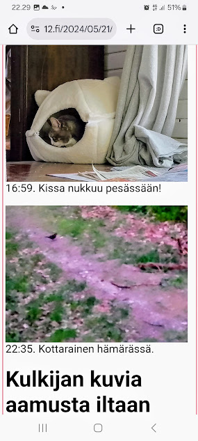 | 21.5.2024. "Kissa nukkuu pesässään!" Kulkijan kuvia aamusta iltaan tiistaina 21.5.2024. ... 16:59. Kissa nukkuu pesässään! 22:35. Kottarainen hämärässä. Paikka: Uusimaa. Kirkkonummi. Björkdal - Keskusta ... Kuvat Pertti Manninen. Tiistai 21.05.2024. https://www.nettisanomat.com/2024/05/21/etusivu.html# |