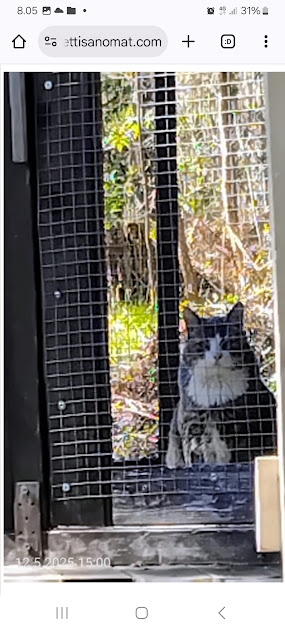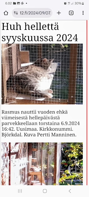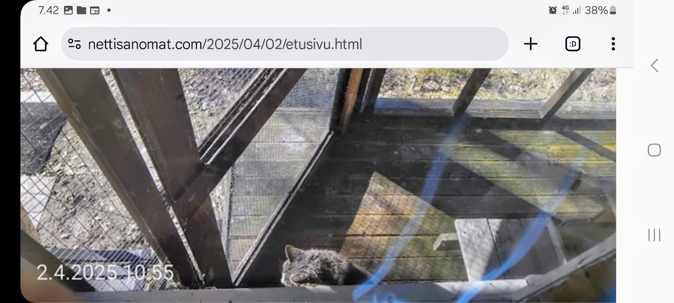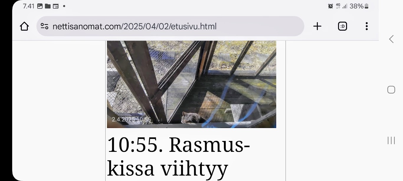 | 2.4.2025. "Rasmus-kissa viihtyy aurinkoisessa häkissään. " Kuuma päivä. Keskiviikko 2.4.2025. 10:55. Rasmus-kissa viihtyy aurinkoisessa häkissään. 11:12. Keltaiset puskevat ruskean läpi. 12:55. Vauhtia ja kuntoa! 13:14. Presidentti soittaa pian toiselle presidentille saatuaan luvan kolmannelta presidentiltä. 14:07. Mittari ei valehtele, 24 astetta! Uusimaa. Kirkkonummi. Björkdal - Lapinkyläntie - Veikkola - Björkdal. Kuvat Pertti Manninen. https://www.nettisanomat.com/2025/04/02/etusivu.html