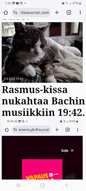 | 9.4.2025. "Rasmus-kissa nukahtaa Bachin musiikkiin." Keskiviikko 9.4.2025. Mikael Agricolan ja suomenkielen päivä. Kahdeksan kuvaa. Aamun ensimmäinen 7:37. Tuulen viemää 13:02. Tuulen tuomaa 13:26. Kaisa Hietanen kertoo levottomista jaloista 14:02. Lippu liehuu päiväkodin pihassa 14:50. Lippu liehuu kaupan pihassa 14:55. Rasmus-kissa nukahtaa Bachin musiikkiin 19:42. Goldberg-muunnelmat 19:44. Hämärä kirkastuu vielä kerran 20:18. Uusimaa. Kirkkonummi. Björkdal ja Veikkola. Keskiviikko 9.4.2025. Kuvat Pertti Manninen. https://www.nettisanomat.com/2025/04/09/etusivu.html