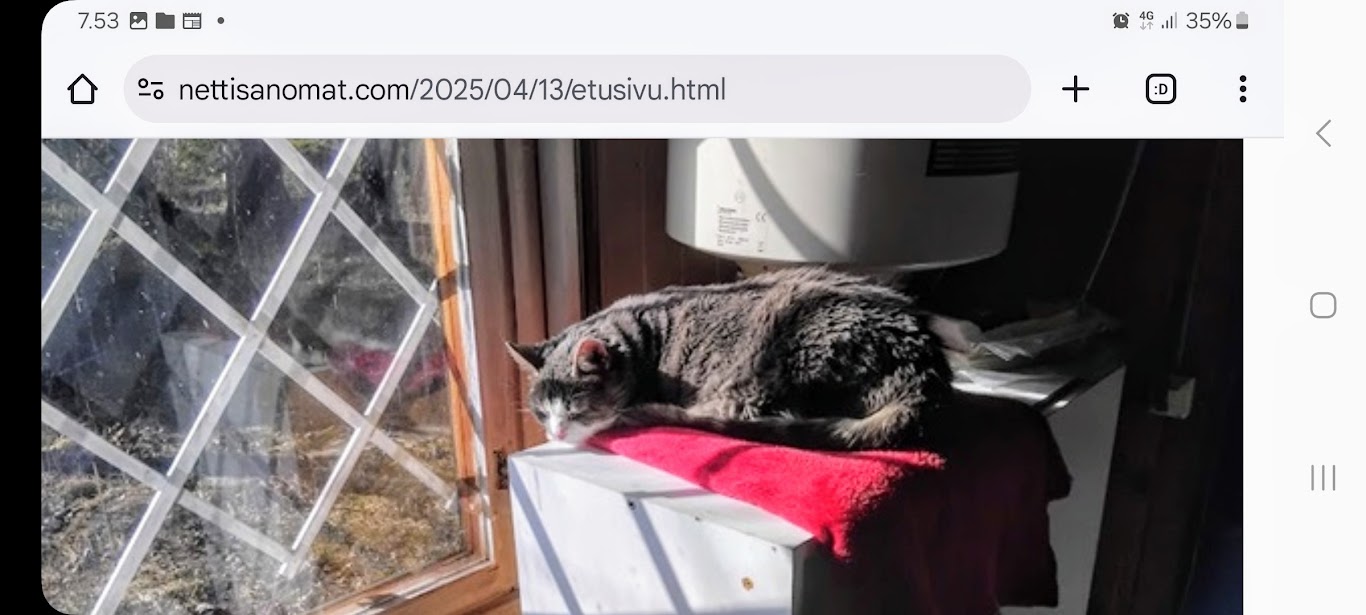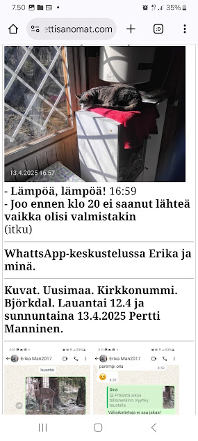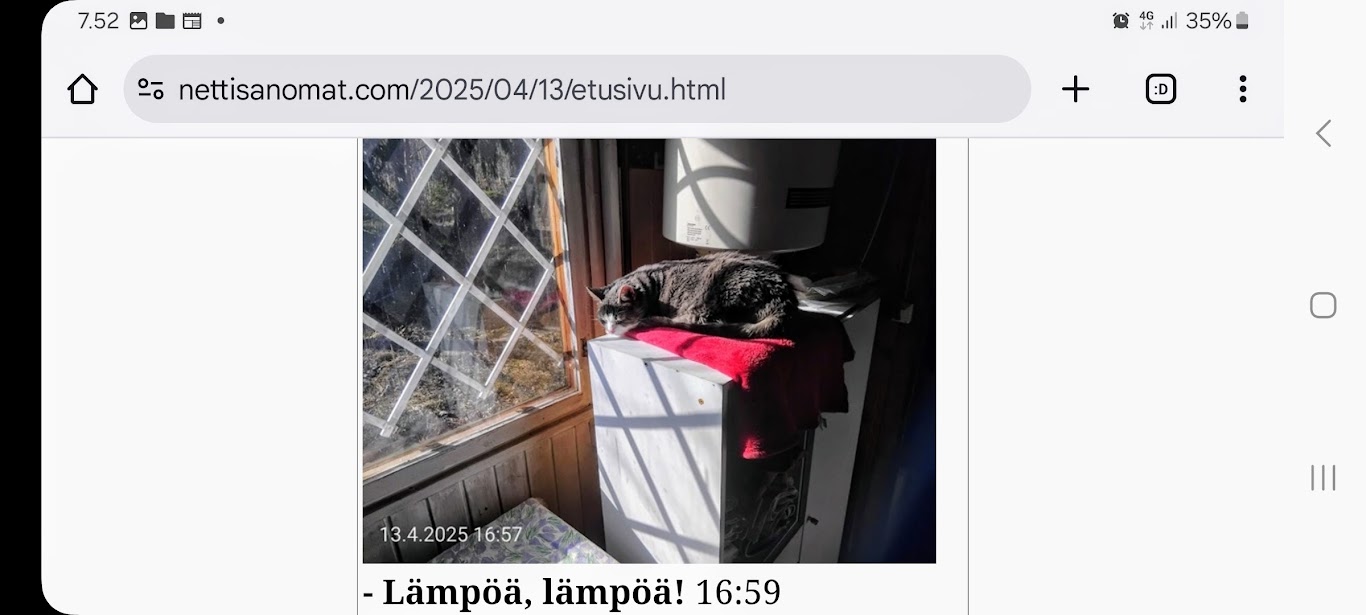 | 13.4.2025. "Lämpöä, lämpöä!" ![]() Lämpöä, lämpöä! 16:59. https://www.nettisanomat.com/2025/04/13/etusivu.html