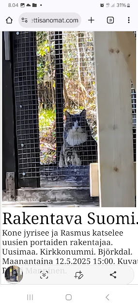 | 12.5.2025. "Rasmus katselee uusien portaiden rakentajaa." Maanantai 12.5.2025. Snellmanin päivä - Suomalaisuuden päivä. Rakentava Suomi. Kone jyrisee ja Rasmus katselee uusien portaiden rakentajaa. Uusimaa. Kirkkonummi. Björkdal. Maanantaina 12.5.2025 15:00. Kuvat Pertti Manninen. |