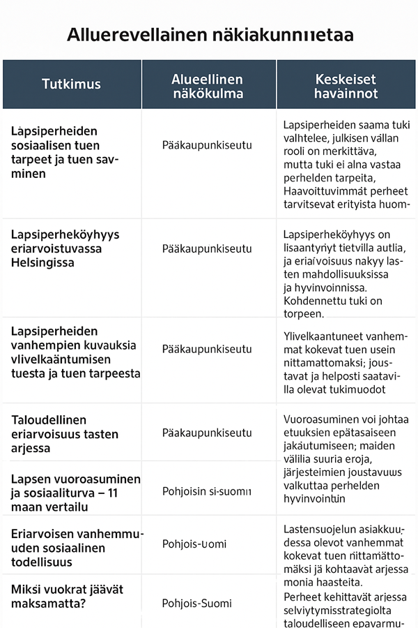 Tämä taulukko antaa kokonaiskuvan merkittävistä tutkimuksista, jotka käsittelevät lapsiperheiden asemaa, eriarvoisuutta ja sosiaaliturvaa Suomessa.