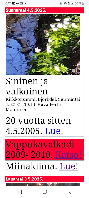 ![]() Sininen ja valkoinen. Uusimaa. Kirkkonummi. Björkdal. Sunnuntai 4.5.2025 10:14. Kuva Pertti Manninen. |
