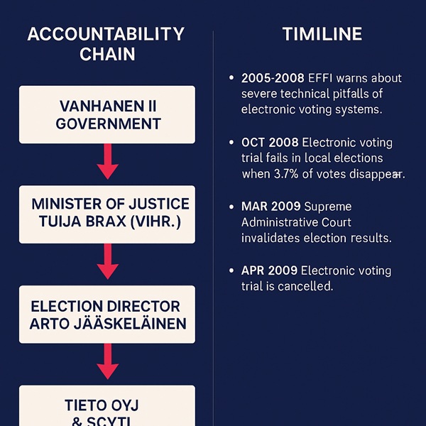 Tässä on ehdotus sosiaalisen median julkaisun tekstiversioksi – sopii esimerkiksi Twitteriin, Facebookiin tai LinkedIniin: 🗳️ Sähköinen äänestys – epäonnistunut kokeilu Suomessa (2005–2009) Suomi testasi sähköistä äänestystä kunnallisvaaleissa 2008. Tuloksena: äänet katosivat, vaalisalaisuus vaarantui, ja KHO kumosi vaalituloksen. Kukaan ei joutunut vastuuseen – hanke lopetettiin. 🔗 Vastuuketju: Vanhasen II hallitus → Oikeusministeri Tuija Brax → Vaalijohtaja Arto Jääskeläinen → Tieto Oyj & Scytl 📅 Aikajana: • 2005–2008: Effi varoittaa riskeistä • Lokakuu 2008: Äänet katoavat kokeilussa • Joulukuu 2008: Auditointi paljastaa 14 tietoturvapuutetta • Huhtikuu 2009: KHO kumoaa tuloksen • 2009: Hanke keskeytetään ❗️Miksi hyvin toimiva paperijärjestelmä haluttiin korvata riskialttiilla sähköisellä – muodikkuuden vuoksi? 📊 Katso visuaalinen kaavio alta 👇 Haluatko, että muotoilen tästä myös englanninkielisen version tai teen siitä karusellipostauksen rungon Instagramiin?
