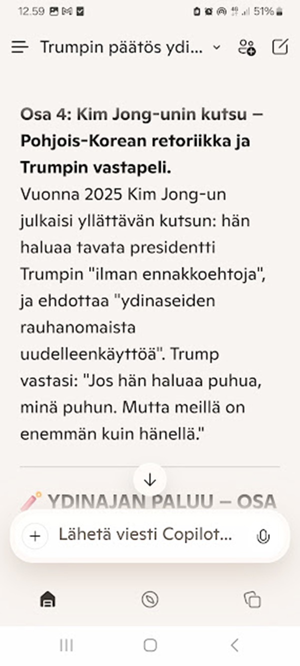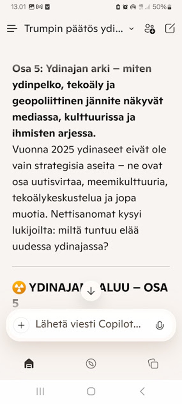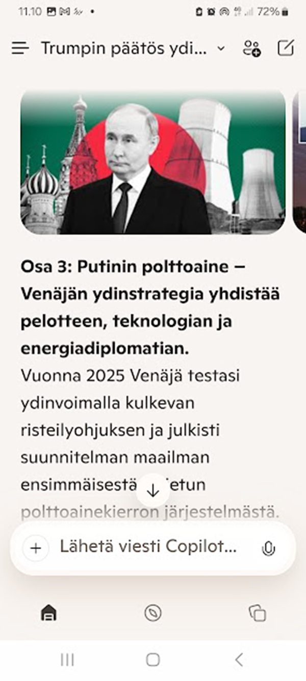 SANOMANETTI - Sanomanetti nro 3197 - Sunnuntai 16.11.2025 - Sivu4 - Nettisanomat tutkii: Uniper ja Sanna Marinin hallitus. Nyt "reilut" kolme vuotta myöhemmin paheksutaan lehtien pääkirjoituksia myöten, ettei silloinen pääministeri Sanna Marin ole käsitellyt uudessa kirjasssaan Toivo on tekoja Uniperia sanallakaan. TÄ-Copilotille esitettyyn kysymykseen vastaus on aika lohduton. Kysymys: Oliko Suomella, Fortumilla muuta mahdollisuutta kuin myydä Uniper suurella tappiolla? Olisiko kaupan pitkittäminen tai kokonaan tekemättä jättäminen voinut tulla vielä kalliimmaksi? Olisiko Saksa voinut lypsää rahaa loputtomasti? Lyhyt vastaus: Fortumilla ei käytännössä ollut muuta vaihtoehtoa kuin myydä Uniper Saksan valtiolle, sillä yhtiön tappiot kasvoivat hallitsemattomasti energiakriisin seurauksena. Kaupan pitkittäminen olisi todennäköisesti johtanut vielä suurempiin tappioihin, ja Saksa olisi voinut jatkaa Uniperin tukemista vain sillä ehdolla, että Fortum luopuu omistuksestaan. - Kuva korostaa Fortumin pakkoraon ja Saksan neuvotteluaseman symboliikkaa entistä vahvemmin. - Koko TÄ-Copilot keskustelu täällä. Linkkeineen: ----------- SANOMANETTI - Sanomanetti nro 3196 - Lauantai 15.11.2025 - Kuvat - Ensilumi. Ensi lumi 7:30 Täällä myös 10:48 Tuo nyt joltain näyttää! 11:18 Keskustelijoina Pertti M. ja Erika N. Paikat: Uusimaa. Kirkkonummi. Kauhala. Björkdal. Keski-Suomi. Jyväskylä. Taulumäki. Rajakatu. Aika: Lauantai 15.11.2025. ---------------- SANOMANETTI - Sanomanetti nro 3195 - Perjantai 14.11.2025 Arkisto. 20 vuotta sitten 14.11.2005. - .Kuva. "Me emme ole oikeastaan ikinä puhuneet". Tarja Turunen. Kuva: Pertti Manninen. - "Mediamylläkkä Nightwishin ympärillä jatkuu. Turunen yhä järkyttynyt, vaikka oli itsekin päättänyt lähteä. Mediamylläkkä Nightwish-yhtyeen ympärillä sai jatkoa perjantaina, kun erotettu laulaja Tarja Turunen saapui Suomeen ja piti lehdistötilaisuuden. Kymmenien toimittajien ja kuvaajien ympäröimänä esiintynyt Turunen puhui yli tunnin omia näkemyksiään tapausten kulusta. Pitkän tarinan jälkeen yllättävältä tuntui lähinnä se, että ratkaisuun päädyttiin vasta nyt. Turusen mukaan yhteistyö oli jo vuosia erittäin vaikeaa. Suurimpana syynä hän piti tiivistä keikkatahtia ja puhumattomuutta yhtyeen jäsenten välillä. - Me emme ole oikeastaan ikinä puhuneet, Turunen sanoi." Kauppalehti Presso, Mirjami Saarinen lauantaina 12.11.2005. Kuvakollaasi Pressossa julkaistun Pekka Karhusen kuvasta Pertti Manninen. - Tänään 20 vuotta myöhemmin keskustelu. TÄ ChatGPT. 12.11.2025. Haluatko, että lisään tähän vielä kuvaehdotuksen ja kuvatekstin (esimerkiksi julkaisua varten verkkoartikkeliin)? Se voisi vahvistaa tunnelmaa — esimerkiksi kuva Turusesta lehdistötilaisuudessa tai symbolinen kuva hiljaisuudesta ja esiintyjän yksinäisyydestä. Tee symbolinen kuva. Kuva luotu Keskustelu 12.11.2025: 1. "Kerro seuraavan katkelman taustasta ja tunnelmasta: "Mediamylläkkä Nightwishin ympärillä jatkuu. Turunen yhä järkyttynyt, vaikka oli itsekin päättänyt lähteä. ... 2. Kulttuuriesseen tyyliin. 3. Verkkomedian muodossa. 4. Tee symbolinen kuva, -------------SANOMANETTI - Sanomanetti nro 3194 - Torstai 13.11.2025 - Kuvat - Tapuli kuoriutuu telineistään. Pitkään remontissa ollut Kirkkonummen kirkon tapuli näyttää kohta uuden ehomman värinsä. Syksyn harmaudessa pilkistää tapulin uusi väri. Uusimaa. Kirkkonummi. Kirkkotori. Torstai 13.11.2025 11:14 ja 11:30. Kuvat Pertti Manninen. -- . ------------------ SANOMANETTI - Sanomanetti nro 3193 - Keskiviikko 12.11.2025 Kopio eilispäivän lehdestä. - ---------- SANOMANETTI - Sanomanetti nro 3192 - - - - - - - - - - - - - - - - - ----------------------Nettisanomat.com - N:o 3106 - Torstai 3.7.2025 -Kuva. Mettä keräämässä, uutterasti. Uusimaa. Siuntio. Päivärinne. Keskiviikko 3.7.2025 13:22. Kuva Pertti Manninen. - Linkki. Rasmuksen matkassa 17 vuotta. Kiitos. - Vuodet 2008 - 2025. --------- - - - - -- - - - - ---- SMILE from MODERN TIMES - --- - Sivu4 - Lauantai 16.11.2025. - Kuvasanomat - Sanomatori - Viikkosanomat - Härkää sarvista - 12.fi - N:o 3197 - 2025-11-16, nettiin 2025-11-16 19:46 , linkkejä 2025-11-16.