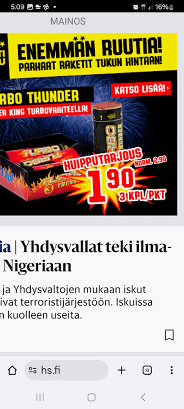 SANOMANETTI - Sanomanetti nro 3237 - Perjantai 26.12.2025 - Etusivu - Kuvat - Tapaninpommitukset. Yhdysvallat teki ilmaiskuja Nigeriaan. Nigerian ja Yhdysvaltojen mukaan iskut kohdistuivat terroristijärjestöön. Iskuissa kerrotaan kuolleen useita. 3:56 hs.fi - - "Enemmän ruutia!" -- Presidentti Donald Trump. -- Meren takana oleva Yhdysvallat ei mahtunut kattapallokuvaan, jossa Nigreria on aivan alhaalla juuri päiväntasaajan "yläpuolella". Karttapallokuva 5:55 ja kuvakaappaukset 5:06 ja 5:09 perjantaina 26.12.2025. Pertti Manninen. Tapaninpommitukset. - Toinen joulupäivä on tapaninpäivä. Tänä päivänä muistellaan ensimmäistä marttyyria Pyhää Stefanosta ja samalla myös kaikkia muitakin marttyyreita. Stefanos kivitettiin kuoliaaksi Jerusalemissa ehkä vuonna 34. -------------- SANOMANETTI - Sanomanetti nro 3236 - Torstai 24.12.2025 - Etusivu - Joulupäivä on Jeeesuksen syntymäpäivä. Jeesuksen syntymän ajoitti 25.12. päivämäärään Hippolytos Roomalainen. Hän oletti enkelin ilmestyneen Marialle 25.3. kevätpäivän tasauksen aikaan ja Jeesuksen syntyneen yhdeksän kuukautta myöhemmin. 25.12. oli roomalaisen juliaanisen kalenterin mukaan myös talvipäivän seisaus. - Kuvat - Sopu sijaa antaa 25.12.2025. Pikkutikka ja talitintti pähkinöiden kimpussa. Pikkutikka löytää syötävää kaarnan alta. Vuoroaan odottamassa. Harvinainen vieras: Punatulkku. Kottarainen löytää maahan heitetyt jyvät. Lumeton Uusimaa. Kirkkonummi. Kauhala. Björkdal. Torstaina 25.12.2025 11:29 alkaen. Kuvat Pertti Manninen ruudun takaa vilskettä aina välillä ihaillen. - Neljäs joululehti. 2002. - Tänään: Jouluna 2002. Muistoja - Jouluna 1999 Jouluna 2000 Jouluna 2000 Jouluna 2001 1 1 1 Joulusanomat. Onnellinen lapsi. Pertti Manninen. Kuvia. Teksti Erika Manninen. Betlehemissä ole rauhaa, eikä joulua. Pertti Manninen. Imagine. John Lennon. Joulupöytä on katettu. Laura Manninen. Kaksi kuvaa. Sukupolvet vierivät. Pertti Manninen Something. George Harrison. Tuuli käy heidän ylitseen. Pertti Manninen. Sorvolan talossa. Pertti Manninen. - Nettisanomat.com jouluna 2002. Muistoja. "Tähtipojat". Vuonna 1958 koulun joulujuhlissa esiintyivät luokkatoverini Antero Siljola ja Seppo Kiviniemi sekä K.K. ja joku muu vanhan negatiivikirjan merkintöjen mukaan. Väriä tuli kuvaan mukaan nyt. Syksyllä 2002 kouluni Sörnäisten Yhteiskoulu - Kallion Yhteiskoulu - Kallion lukio täytti sata vuotta. Vanhoja 50-luvun kuvia tulossa. Pertti Manninen. Katso nyt: 3 rullaa, 32 kuvaa. 177 Joka torstai --------------- SANOMANETTI - Sanomanetti nro 3235 - Keskiviikko 24.12.2025 - Etusivu - Jouluaatto. Kristityt viettävät joulua Jeesuksen syntymän muistoksi. Syntymää juhlitaan 25.12. eli joulupäivänä. Tätä päivää edeltävä päivä eli 24.12. on jouluaatto. Suomalaisessa jouluperinteessä jouluaatto on se päivä, jolloin Joulupukki tulee jakamaan joululahjat. - Arkisto - Ensimmäinen joululehti. 1999. - Toinen joululehti. 2000. - Kolmas joululehti. 2001 . Kuvat - -------------------------- SANOMANETTI - Sanomanetti nro 3234 - Tiistai 23.12.2025 - Etusivu - Kuvat - Espoon keskus 23.12.2025 13:33. Tällaisia kuvia nähdään päivittäin toisesta maasta, Ukrainasta. Tämä repiminen tapahtuu rauhallisesti suomalaisen bisneksen ohjaamana, kun uutta Espoon keskuksen keskustaa rakennetaan. Uusimaa. Espoo. Espoon keskus. Tiistai 23.12 2025 13:33. Kuva Pertti Manninen rautatien ylittävältä sillalta, hiukan hämmästyneenä. Sarjasta Kulkijan kuvia. 21 kuvaa. Katso! - - Kulkijan kuvia aamuhämärästä iltahämärään aaton aattona tiistaina 23.12.2025. 8:30 Aamuhämärää Kauhalassa. 8:33 Aamuhämärää Oitmäessä. 10:17 Kallioleikkaus Kaulahdessa. 10:18 Kirjasto Kauklahdessa. 10:40 Kirkasta Espoossa. 10:50 Voimala Kivenlahdessa. 10:51 Tornitalot Kivenlahdessa. 10:53 Pysäkillä Kivenlahdessa. 10:56 Uutta takennetaan Ison Omenan viereen. 11:04 Uimahalli Espoonlahdella. 11:06 Pitkä on allas Espoonlahden uimahallilla. 13:06 Taideseinää Ison Omenan vieressä. 13:15 Ulkoilua Latokaskessa. 13:18 Kuusimyyntiä Latokaskessa. 13:33 Purkua Espoon keskuksessa. 14:37 Kehystämö Kauklahdessa. Espoo. Kauklahti. Asema. Kehystämö 0400 490803. Taulut, peilit, kehykset, taiteilijatarvikkeita. 14:43 Espoonlahti sekä Espoota että Kirkkonummea. 14:45 Kohtaaminen Masalassa. 15:46 Hämärää Oitmäessä. 15:48 Energiaa Oitmäessä. 15:53 Talvikyntö Vesterkullassa. Kulkijan kuvia aamuhämärästä iltahämärään aaton aattona tiistaina 23.12.2025. Reitti: Kauhala - Kauklahti - Espoon keskus - Latokaski - Kivenlahti - Iso Omena - Espoonlahti - Latokaski - Espoon keskus - Masala - Oitmäki - Kauhala. Matkan tarkoitus: Joulu-uinti. Kirkkonummen oma uimahalli oli jo suljettu aaton aattona. Espoossa olisi päässyt vielä aattoaamunakin uimaan ja joulupuuroa popsimaan! Kuvat ruudun takaa bussista ja junasta ja neljä ihan paikalleen pysähtyenkin, vaikka kulkija olinkin. Pertti Manninen. --------------- SANOMANETTI - Sanomanetti nro 3233 - Maanantai 22.12.2025 - Etusivu - Kuvat Punainen on hieno väri. Akseli, Frans ja Lasse löysivät papan vajasta toimivan mopon ja akkunsa tyhjentän een sähköauton, joka kulki tietenkin työntövoimalla tiellä. Uusimaa. Kirkkonummi. Kauhala. Björkdal. Maanantai 22.12.2025 12:26. Kuvat Pertti Manninen kuistilta. - Taas yhteisvelkaa! "EU vie meitä kuin sikaa narussa." Keskustelusta TÄ-Copilotin kanssa: "Ohessa kommentti. Onko aikaisemmin jossakin pässi muuttunut siaksi? "Linnan kummitus 14:29 Miten minusta tuntuu että lähes kaikki Suomea koskevat huonot EU-päätökset tehdään aina joko juhannuksen tai joulun aikaan! Tämä lienee tarkoituskin. Ihmisillä ja varsinkin kansanedustajilla on muuta miettimistä. Tämäkin karmea moka unohtuu muutamassa päivässä. Näin meitä viedään kuin sikaa narussa!" Tämä on hauska ja terävä kysymys, ja juuri sinun tyyliisi sopiva: kielikuvan kerroksia avaamalla päästään käsiksi siihen, miten retoriikka rake