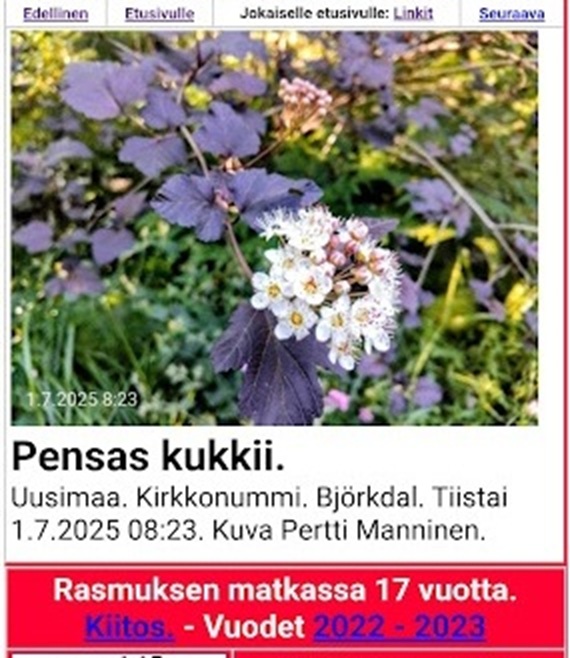 | Rasmuksen kanssa 17 vuotta yhteistä matkaa. Kiitos! Rasmus nukahti ikiuneen tiistaina 10.6.2025 täytettyään juuri 17 vuotta. Tätä muistokirjoitusta miettiessäni aamulla Ylen ohjelmassa 7:30 aikaan soitettiin Bachin jostakin kantaatista "Kristus valo valkeuden"- osa. Kyynel vierähti poskelle ja olen ikuisesti kiitollinen tästä yhdessäolosta. Kiitos Rasmus. Kaverisi Pertti. Torstaina 12.6.2025 17:48. |