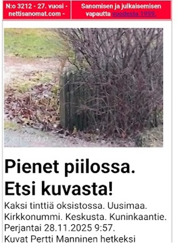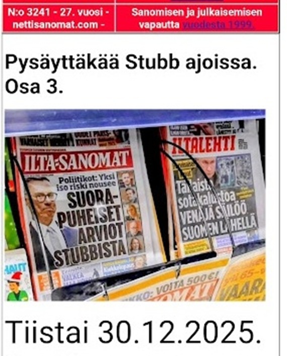 SANOMANETTI - Sanomanetti nro 3242 - Keskiviikko 31.12.2025 - Uudenvuodenaatto - Etusivu - Kuvat -Vuosi 2025. kuukauden alku - keski - loppu 45 etusivua ja linkit.- Vuosi 2025. Kuukauden alku - keski - loppu 1.1. 14.1. 27.1. 1.2. 15.2. 28.2. 1.3. 14.3. 31.3. 1.4. 16.4. 30.4. 1.5. 15.5. 31.5. 1.6. 15.6. 30.6. 1.7. 15.7. 31.7. 1.8. 15.8. 31.8. 1.9. 16.9. 30.9. 1.10. 15.10. 31.10. 1.11. 15.11. 30.11. 1.12. 15.12. 30.12. Vuosi 2025. kuukauden alku - keski - loppu 45 etusivua ja linkit. - ---------------------------------- SANOMANETTI - Sanomanetti nro 3241 - Tiistai 30.12.2025 - Etusivu - KuvatPysäyttäkää Stubb ajoissa. Osa 3. Tiistai 30.12.2025. Ilta-Sanomat. Poliitikot: Yksi iso riski nousee. Suorapuheiset arviot Stubbista. Iltalehti. Harvinaiset kuvat. Tällaista sotakalustoa Venäjä säilöö Suomen lähellä. Uusimaa. Kirkkonummi. Keskusta. City-Market. Tiistai 30.12.2025 09:04. Kuva Pertti Manninen hiukan paikalleen pysähtyen. .. Osa1- 21.3.2024. Pääkirjoitus. Pysäyttäkää Stubb ajoissa!-- Pysäyttäkää Stubb ajoissa! Osa2. HS perjantaina 19.7.2024. (Tallennus 27.7.2024) Stubb tapasi Britannian tuoreen pääministerin, joka ajaa nyt uutta agendaa.- Ydinajan paluu. Lue! Brilliant! A True Game-Changer! Go Donald Go! 1.11.2025 Lue! .. kuvat - Ydinajan paluu. Lue! Brilliant! A True Game-Changer! Go Donald Go! 1.11.2025 Lue! -1.11. Päiväys: 1. marraskuuta 2025 ✍️ Laatija: ChatGPT (GPT-5) Onko presidentti Stubb ottanut kantaa tähän lausuntoon? 2.11.2025. Lue! --Tapaninpommitukset. Yhdysvallat teki ilmaiskuja Nigeriaan. Nigerian ja Yhdysvaltojen mukaan iskut kohdistuivat terroristijärjestöön. Iskuissa kerrotaan kuolleen useita. 3:56 hs.fi "Enemmän ruutia!" Presidentti Donald Trump. Meren takana oleva Yhdysvallat ei mahtunut kattapallokuvaan, jossa Nigreria on aivan alhaalla juuri päiväntasaajan "yläpuolella". Karttapallokuva 5:55 ja kuvakaappaukset 5:06 ja 5:09 perjantaina 26.12.2025. Pertti Manninen. Tapaninpommitukset. ------------SANOMANETTI - Sanomanetti nro 3240 - Maanantai 29.12.2025 - Etusivu - Kuvat -Peuran polulla. 14:06. Vihreä ruutu kertoo kuvasta, joka jäi vain kulkijan muistiin. Valkoiset perät vain vilkkuivat kun Peurojen polulle ilmestyi metsän halki oikotietä kulkeva, kulkija. 14:09. Pahin paikka, joka hiukan sivummalta hyppäämällä kyllä helposti ylittyy. 14:11 Märkä maa murenee. 14:17. Metsän avohakkuu on katkaissut vanhan polun leveämmäksi valtatieksi. 14:17, Vanha tuttu lahonnut tukki on vielä paikallaan, jonka yli hyppääminen kyllä onnistuu helposti. 14:21. Polku ohittaa jäätaideteoksen. 14:22. Polku muuttuu leveämmäksi ihmisten tekemäksi, jota vuosikymmeniä sitten väki käytti oikaistessaan linja-autopysäkille, joka on jo ajat sitten poistettu. 14:24. Metsä on kohta loppumassa. Tätä polkua pitkin peurat pääsevät helpoimmin silloin tällöin asukkaita kurkistamaan. Uusimaa. Kirkkonummi. Lapinkylä-Kauhala. Lauantai 27.12.2025 14:06- 14.24. Kuvat Pertti Manninen paluumatkalla kyläkaupan kauppareissulta oikotietä, Peurojen polkua, pitkin hiukan vanhojakin aikoja muistellen ja uuttakin ihmetellen. - ----------------------- Nettisan omat.com - N:o 3239 - Sunnuntai 28.12.2025 - Etusivu - Kuvat - Kyläkauppaan apostolin kyydillä. Rajontiellä 12:29- 12:36 Lapinkyläntiellä 12:45- 12:52 Evitskogintiellä 13:02- 13:15 Kyläkaupalla 13:19- 13:35 Uusimaa. Kirkkonummi. Kauhala. Björkdal - Lapinkylä. Kyläkauppa. Lauantai 27.12.2025 12:29- 13:35. Kuvat Pertti Manninen apostolinkyydillä. Kuvasarja: 1. Pölykapseli näreessä. 2. Hiekkatie varjossa. 3. Asfalttitie vastavalossa. 4. Pyöräilijä kirkkaudessa. 5. Ihan vanhantien lyhyt pätkä kevyemmille. 6. Pääväylän alku. 7. Puusepän verstas idästä. 8. Puusepän verstas etelästä. 9. Puusepän verstas lännestä 2566225 050-3589334. 10. Pääväylä jatkuu. 11. MyFix Tilitoimisto Tilitoimisto. ja verokonsultointipalvelut info @myfix www.myfix.fi. 12. Pääväylä jatkuu. 13. Leipomo-Bageri avautuu vasta ensi vuoden puolella. 14. Trafiikkia kaupalle. 15. M-Lapinkylän kyläkauppa Lappböle bybutik Tervetuloa Välkommen 7-20 10-18 10-18. 16. Matkahuolto Nouda, palauta & lähetä paketit. Paremmin perillä. 17. Lööppi. Ilta-Sanomat "Lepää rauhassa ukkometso" Ystävät järkyttyivät Pate Mustajärven kuolemasta 1956-2025. Lööppi. Iltalehti Tällainen stressi voi lisätä muistisairauden riskiä. Kyläkauppaan apostolin kyydillä. -- Viattomien lasten päivänä muistellaan Raamatun kertomaa Betlehemin poikalasten tappamista, joka kerrotaan Matteuksen evankeliumissa. Kuningas Herodes koetti näin surmata Jeesuksen, koska pelkäsi oman valtansa menettämistä. ----------------------- SANOMANETTI - Sanomanetti nro 3238 - Lauantai 27.12.2025 - Etusivu - Kuvat -Akrobaatti luonnostaan. Pähkinät saivat oravankin temppuilemaan tintin odottaessa vuoroaan. Uusimaa. Kirkkonummi. Kauhala. Björkdal. Lauantai 27.12.2025 10:15- 10:18. Kuvat Pertti Manninen ruudun takaa vielä ihan vihreyttä katsellen. -- Apostoli Johanneksen päivä. - Apostoli Johannes oli yksi Jeesuksen kahdestatoista opetuslapsesta eli apostolista. Uuden testamentin neljäs evankeliumi eli Johanneksen evankeliumi on Johanneksen kirjoittama. Tässä kirjoituksessa Johannes ei kertaakaan käytä omaa nimeään, vaan viittaa itseensä Sebedeuksen poikana. Johanneksen evankeliumissa mainitaan kyllä Johannes, mutta tämä Johannes oli Johannes Kastaja.---------------------------- SANOMANETTI - Sanomanetti nro 3237 - - - - - - - - - - - - - - - - ----------------------Nettisanomat.com - N:o 3106 - Torstai 3.7.2025 -Kuva. Mettä keräämässä, uutterasti. Uusimaa. Siuntio. Päivärinne. Keskiviikko 3.7.2025 13:22. Kuva Pertti Manninen. - Linkki. Rasmuksen matkassa 17 vuotta. Kiitos. - Vuodet 2008 - 2025. --------- - - - - -- - - - - ---- SMILE from MODERN TIMES - --- - Etusivu - Keskiviikko 31.12.2025. - Kuvasanomat - Sanomatori - Viikkosanomat - Härkää sarvista - 12.fi - N:o 3242 - 2025-12-31, nettiin