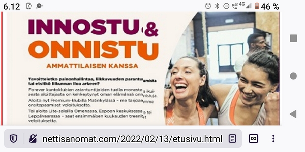 Kuvat 2022.02 Helmikuu 2022/02/05 - N:o 2459 - Helmikuun 5. päivänä 2022 J.L. Runeberg 218 vuotta. - 10 vuotta sitten. Kaksi ilmoitusta Keskisuomalainen- sanomalehdessä lauantaina 2012-02-04, Presidentinvaalien 2012 aattona. - Koko Suomen presidentti, hyvä keskustalainen teko. - Pekka-festarit. 2022/02/06 - N:o 2460 - Helmikuun 6. päivä 2022. Saamelaisten kansallispäivä. Kuva: "Miksi olette niin hienoina tänään? Nyt on saamelaisten syntymäpäivä." - Ylen Radio 1:stä Sovinto- ja totuuskomiteasta puheentunnistusohjelmalla: sarjasta epätäydellinen maailma: "... Sinä Irja Jefremoff ensimmäisenä tässä puheenjohtaja vuorossa ..." Kuvat lauantaina 12.2.2022. 2022/02/12 - N:o 2461 - Hurraa, pääsee taas hikoilemaan! Joo.Arena - Tätä on odotettu! Stepup School - Liike on lääkettä! Esport - Länsiväylän 9.2.2022 ilmoituksista. Kuvat sunnuntaina 13.2.2022. 2022/02/13 - N:o 2462 - Innostu & onnistu! Forever Pihlajalinna - Täydellistä rentoutumista! Kellumo - Kimpassa kuntoon! Espoon ohjattu liikunta - Kursseilla kondikseen! Espoon ohjattu liikunta - Hurraa, pääsee taas hikoilemaan! Joo.Arena - Tätä on odotettu! Stepup School - Liike on lääkettä! Esport - Länsiväylän 9.2.2022 ja 12.2.2022 ilmoituksista. Kuvat maanantaina 14.2.2022. Ystävänpäivä. 2022/02/14 - N:o 2463 - Ystävänpäivä. Niinistö ... toimia