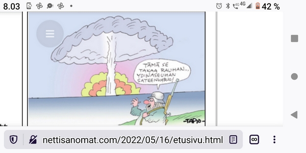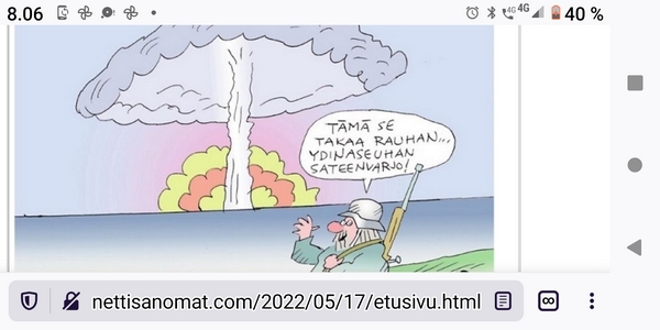 Kuvat 2022.05 Toukokuu 16.5-31.5. Kuvat maanantaina 16.5.2022. 2022/05/16 N:o 2513 - Tämä se tekee rauhan... ydinaserauhan sateenvarjo! (Tapio. Kirkkonummen Sanomat). 2022/05/16 N:o 2513 - Tästä ei kerrota suomalaisille. Suomesta tulossa ydinasevaltio, joka sitoutuu NATO:n ydinasedoktriiniin: First Use-doktriinin mukaan ydinaseita voidaan käyttää sellaisia maita vastaan, jotka eivät ole hyökänneet liittolaismaahan tai, joilla itsellään ei ole ydinaseita. 2022/05/16 N:o 2513 - SYYSKUU 2016. ORAVA TAMMESSA. 2022/05/16 N:o 2513 - Iltalehden lukijan kommentti. llmari H. "Kun 2/3 suomalaisista saatiin paniikkiin, ei puolueilla ollut muuta mahdollisuutta kuin lähteä leikkiin mukaan ja myöntää, että sieltä idästä tullaan ihan näillä viikoilla myös Suomeen. Mitäpä jos olisi väittänyt vastaan? Se tärkein, puolueen kannatusluvut olisivat laskeneet maan tasalle. Nyt kaikkien oli kannatettava Kokoomusta ja heidän alkuunpanemaa tärkeää gallup-tulosta." Kuva. 2022/05/17 N:o 2514 - Tämä se tekee rauhan... ydinaserauhan sateenvarjo! (Tapio. Kirkkonummen Sanomat). 2022/05/17 N:o 2514 - Tästä ei kerrota suomalaisille. Suomesta tulossa ydinasevaltio, joka sitoutuu NATO:n ydinasedoktriiniin: First Use-doktriinin mukaan ydinaseita voidaan käyttää sellaisia maita vastaan, jotka eivät ole hyökänneet liittolaismaahan tai, joilla itsellään ei ole ydinaseita. 2022/05/17 N:o 2514 - SYYSKUU 2016. ORAVA TAMMESSA. 2022/05/17 N:o 2514 - Eduskunta kannattaa Nato-jäsenyyden hakemista murskaluvuin 188-8. (Ilta-Sanomat). Kuva. Kuvat keskiviikkona 18.5.2022. 2022/05/18 N:o 2515 - Tämä se tekee rauhan... ydinaserauhan sateenvarjo! (Tapio. Kirkkonummen Sanomat). 2022/05/18 N:o 2515 - Tästä ei kerrota suomalaisille. Suomesta tulossa ydinasevaltio, joka sitoutuu NATO:n ydinasedoktriiniin: First Use-doktriinin mukaan ydinaseita voidaan käyttää sellaisia maita vastaan, jotka eivät ole hyökänneet liittolaismaahan tai, joilla itsellään ei ole ydinaseita. 2022/05/18 N:o 2515 - SYYSKUU 2016. ORAVA TAMMESSA. 2022/05/18 N:o 2515 - "... valitsemalla johtajalla voi olla maalleen keskellä turvallisuuspoliittisesti epävakaata ajassa.Olette ollut suuri johtaja Suomen kansalle. Kiitos panoksestanna siihen, Svenneling sanoi. Niinistö ei näyttänyt kovin riemastuneelta. Hän myös mutisi jotakin kuulumattomiin jäänyttä vieressään istuneelle valtiopäivien puheenjohtajall Anders Norlénille. (tunnistamaton). Kuva.