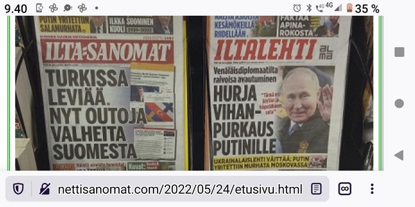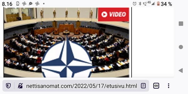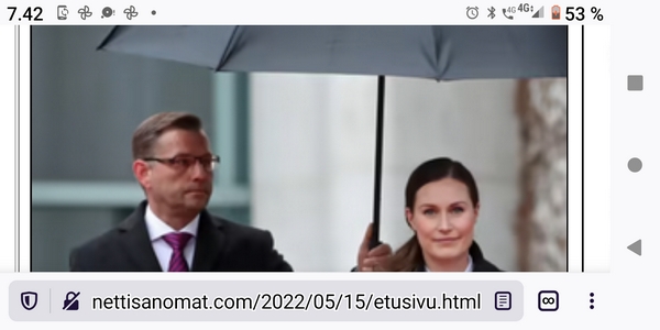 2022/05/15 N:o 2512 - Sunnuntai 15.5.2022. Natoviikolla. SDP:n historiallinen päätös. Suora lähetys kello 12:30 valtiojohto pitää tiedotustilaisuuden Natosta. Suomen matka Natoon alkaa tänään. Nato-ratkaisun hetket. Suomi päättää Natoon hakemisesta tänään. Valtiojohto tekee virallisen päätöksen Nato-jäsenyyden hakemisesta. Erno Laisin uutisanalyysi. Sanaa "historiallinen käytetään usein aivan liian heppoisin perustein. - Natoa vastustavalta Pekalta tiukka viesti valtionjohdolle - Marin: Kärnvapen paraplyet ger säkerhet. Inom Nato finns ett kärnvapenparaply vilket ger den sortens säkerhet, säger Marin. (Yle). Sanna Marin lyfte upp Natos kärnvapen som en säkerhetsgaranti. (Yle). Tämä se tekee rauhan... ydinaserauhan sateenvarjo! (Tapio. Kirkkonummen Sanomat). Kaikkonen kommentti. Pohjatyöt tehty - täältä tullaan. (Kirkkonummen Sanomat). Ruotsin tavoitteena Tanskan ja Norjan malli. (HS). Miten Ruotsi voi yhä toimia diktatuurien vastustajana ja rauhanvälittäjänä, jos maa on puolustusliitossa esimerkiksi Turkin kanssa. (Yle). - jRuotsi esittää yksipuolisesti varaumat ydinaseiden tai ulkomaisten tukikohtien sijoittamista vastaan. Suomi ei ole tehhyt omissa Nato-ilmoituksissaan vastaavia varaumia. (MTV Uutiset). Jenni Haukio twiittaa historiallisesta Nato ... (Iltalehti). Jenni Haukio kommentoi Nato-päätöstö: "Mieli täyttyy ... (Ilta-Sanomat). Jenni Haukio kommentoi Nato-päätöstä: "Mieli täyttyy suuresta ylpeydestä". Maamme on osaavissa käsissä". (Ilta-Sanomat). - Kiitos siitä kun päättäjät kuuntelevat Suomen kansaa (tani. Iltalehti). Missä se kuunteli?. Muutaman epämääräidsen gallupin perusteella, naurettavaa. kansanäänestys on ainut mikä olisi ollut oikea. Demokratian irvikuvaa oli tämä. - PUTIN HUILO. Koonnut sunnuntaina 15.5.2022 Pertti Manninen. -
